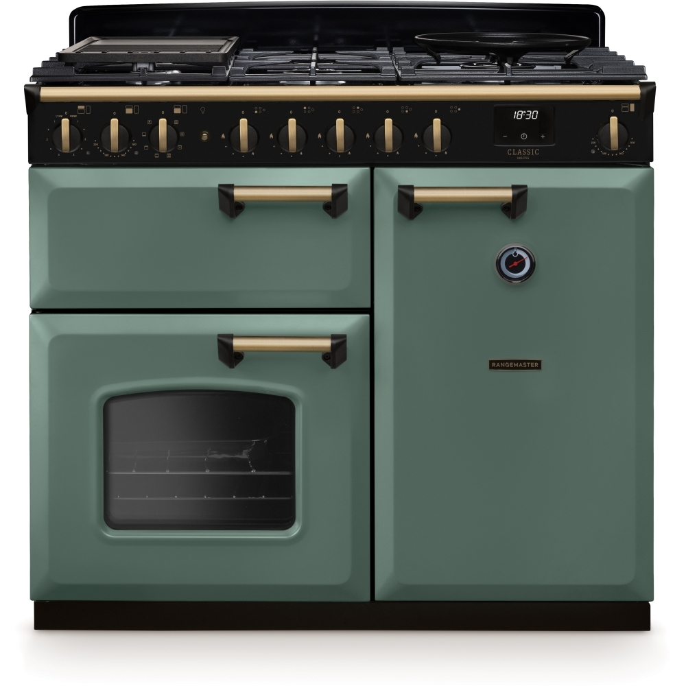 100cm Dual Fuel Range Cooker Classic Deluxe Mineral Green / Antique Brass, A Rated