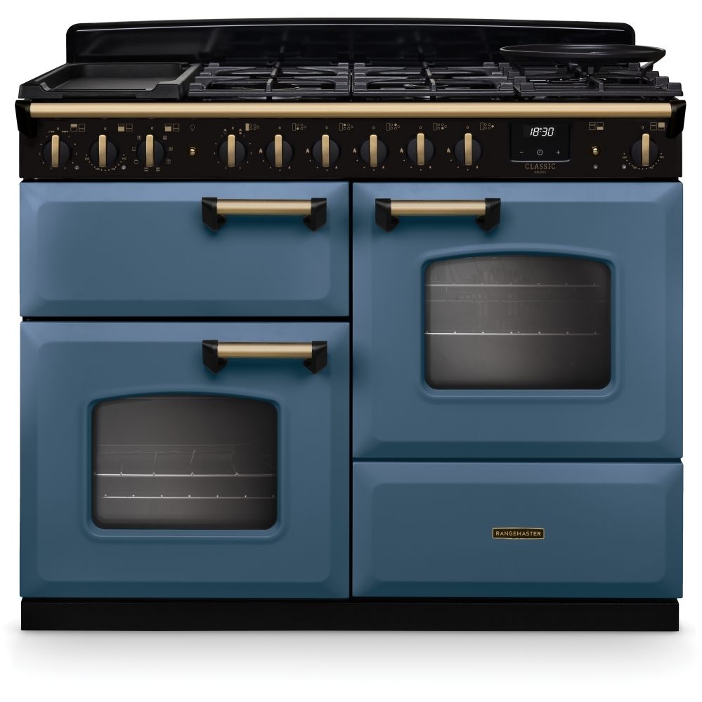 110cm Dual Fuel Range Cooker Classic Deluxe Stone Blue / Antique Brass, A Rated