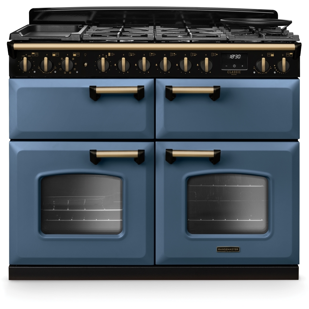 110cm Dual Fuel Range Cooker Classic Deluxe Stone Blue / Antique Brass, A Rated