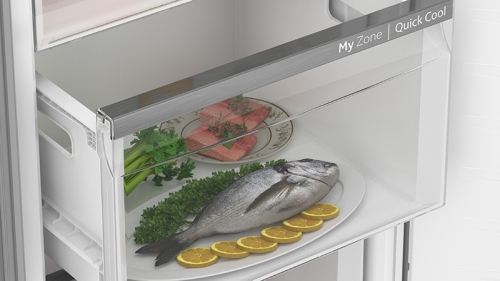 Quick Cool drawer is extremely versatile and it can be used in two different ways directly from the external display. The Quick Cool drawer, it reaches a temperature of 0C faster to better cool down your food. It can be used also as My Zone drawer at 2C to store your meat and fish.