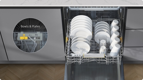 Fit in various sized dishes, glasses and cups. The middle racks tines can be adjusted across 3 settings using a lever and it has a glass holder. A high lower rack with foldable tines at the front helps load dishes and bowls stably, while tines at the back fold down fully to load large items.