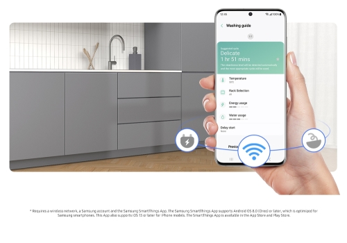 Optimize how you use the dishwasher to suit your lifestyle. The SmartThings App lets you remotely monitor and control it on a smartphone. It also suggests the most effective courses based on how you cook, while helping you reduce energy use, manage consumables and diagnose and resolve errors.