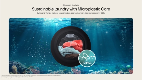 *Tested by Intertek on July 2023. Microplastic Care cycle with 3kg of load(100% polyester training jacket) compared to Mixed Fabric cycle(F4Y7EYPBW). Comparing by measuring the amount of microplastics filtered through a 20? filter.
