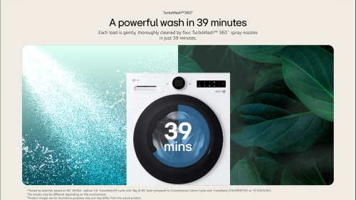 Your laundry can be thoroughly cleaned in just 39 minutes without compromising fabric protection. Thanks to the 3D multi-nozzles that shoot water in four directions, every inch of your laundry gets washed. The Inverter Pump changes the power of the water sprayed, depending on the level of clean needed. By maximizing the dynamic between spray power, detergent, and cycle motion, the LG washer reduces laundry time to just 39 minutes, saving energy by 28%, and reducing clothing damage by 14%.