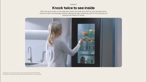 Glass panel with knock on function. When you knock on the sleek mirror-coated glass door, the sensor embedded in the door catches the vibration and turns on the light from inside, showing you what's inside without having to open the door. Lights will automatically turn off after 10 seconds.
