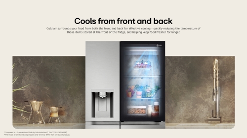 Did you know that the temperature inside your refrigerator varies by areas? LG DoorCooling?™ makes inside temperature more even and cools quicker than a conventional system, promoting longer lasting freshness in your produce and more practical storage.