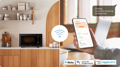 Enjoy added convenience and peace of mind with embedded Wi-Fi. Using a voice assistant[1] on a smartphone, like Samsung Bixby[2] , Amazon Alexa[3] or Google Assistant[4] , you can simply tell the microwave what to do[5]. And the SmartThings App[6] lets you remotely monitor its functions[5].