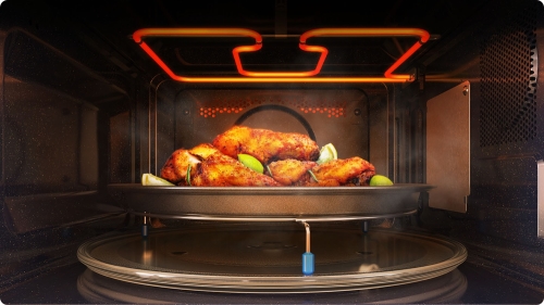 Grill and brown the food in the microwave oven evenly using the Wide Grill. Unlike conventional Samsung microwave ovens, the grill has a wide shape which its effective grilling area covers up to 99% of the turntable and provides a consistent heat distribution. So you can enjoy delicious grilled and browned food.