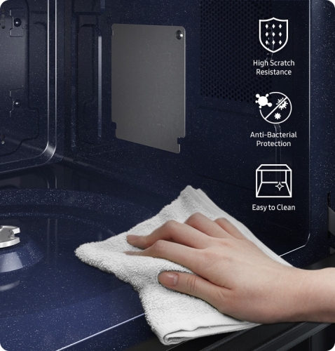 Clean up after cooking easily. The CERAMIC INSIDE™ can be cleaned without scrubbing and wont discolor[9]. Hohenstein confirms that the product enamel of microwave oven shows an antibacterial[10] activity of 99.9%[9]. And its about 24x more scratch resistant[11] than stainless steel.