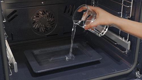 Enjoy deliciously juicy, but crispy food. To use Natural Steam[1] simply place the dedicated tray on the bottom of the oven and pour water onto it. This then creates steam while you are cooking. It helps retain foods natural moisture, so it is juicy and tender inside, but brown and crisp outside.