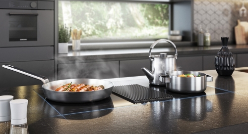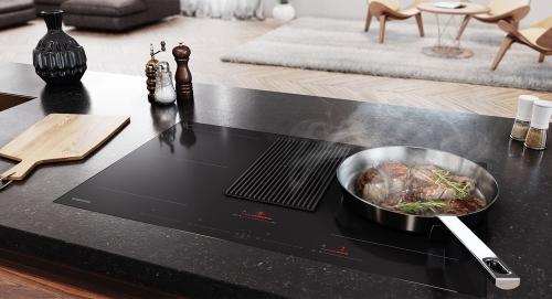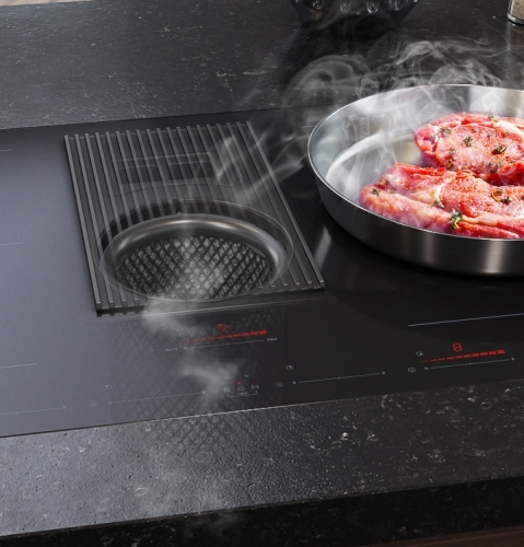 Install your cooktop anywhere and rapidly refresh the air. An integrated hood in the center of the cooktop captures odors and vapors in a flash with a powerful 575m/h ventilation speed. And, with no separate hood, you can install the cooktop wherever you want, like on an island table.