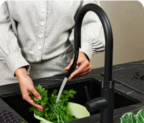 One of the most flexible options, the Quooker Flex is a 3-in-1 boiling, hot, and cold tap, with an optional filter for chilled water. The Flex comes with a pull-out spray hose, making it an ideal choice for rinsing pans and thoroughly cleaning dishes, with no need for scrubbing. When the hose is extended, the boiling water function is disabled for enhanced safety, making it a great option for a family home.