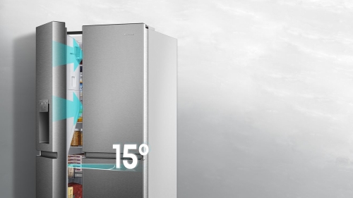 The back wall of the fridge is overlaid with stainless steel, which ensures even distribution of cool air from the inside out. This technology always ensures ideal temperature levels while preventing the loss of cool air and frost build-up in the fridge.
