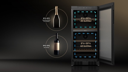 The innovative self-evaporation system effectively manages condensation within the wine cabinet, maintaining a dry and pristine internal environment. This technology eliminates the need for manual condensate pan emptying, ensuring uninterrupted wine quality.