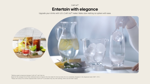 LGs exclusive Craft Ice™: Automatically make upscale, slow-melting round craft ice at home without the work. No more time-consuming molds that only produce one or two at a time. It produces 3 round ice balls or 6 ice balls per day by pushing the freezer button for 3 seconds. You're also able to toggle between 3 and 6 balls from the ThinQ app.