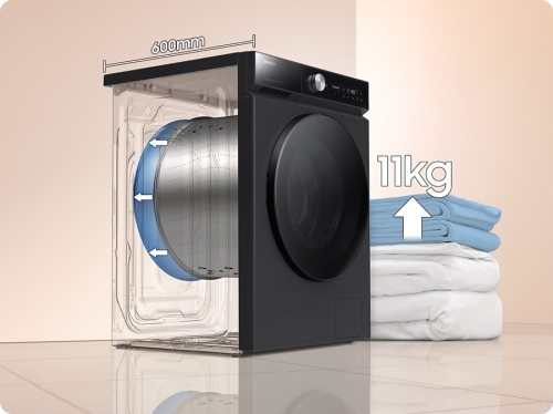 Thanks to a complete interior redesign, our washing machine now holds a large drum boasting a whopping 11kg capacity while the outside dimensions stays the same.